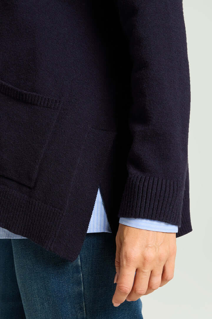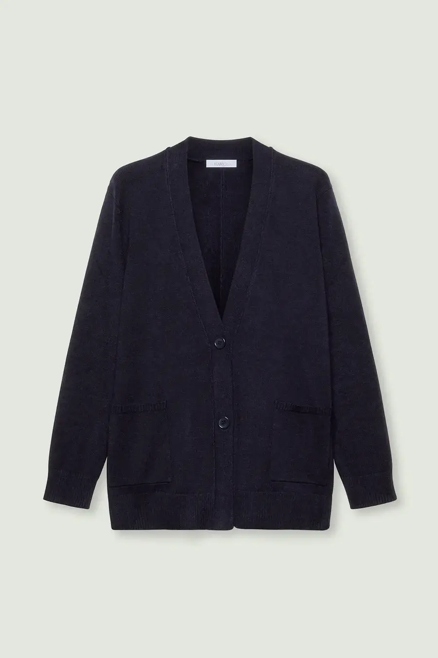 Blago rašireni kardigan s bočnim prorezima. Zatvaranje sa dugmadima i kopčama, našiveni džepovi. Udoban pulover s toplim, mekim i podatnim osjećajem, za one koji vole udobnost viskoze čak i zimi. Model nosi veličinu 37 (46 IT) i visok je 175 cm.